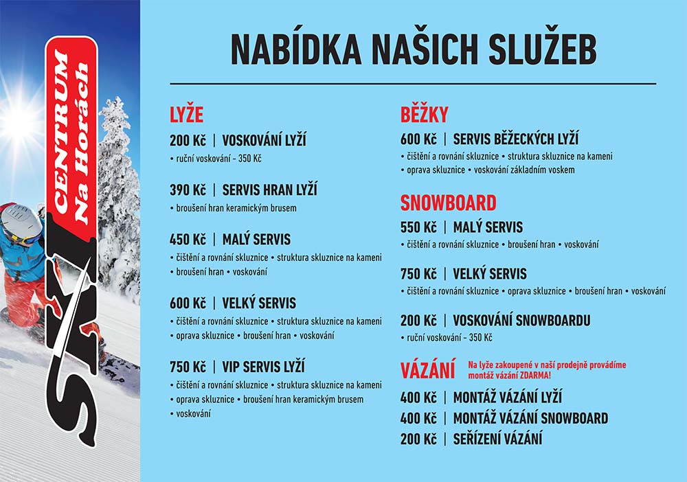 Poskytujeme Vám tu nejvyšší možnou kvalitu služeb v oblasti servisu. Brousíme hrany keramickými kotouči, čistíme, opravujeme a rovnáme skluznice, vytváříme novou strukturu skluznic na kameni a za horka nanášíme na Vaše lyže a snowboardy profesionální skluzný vosk.